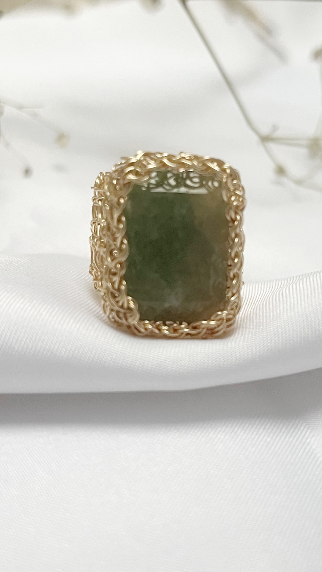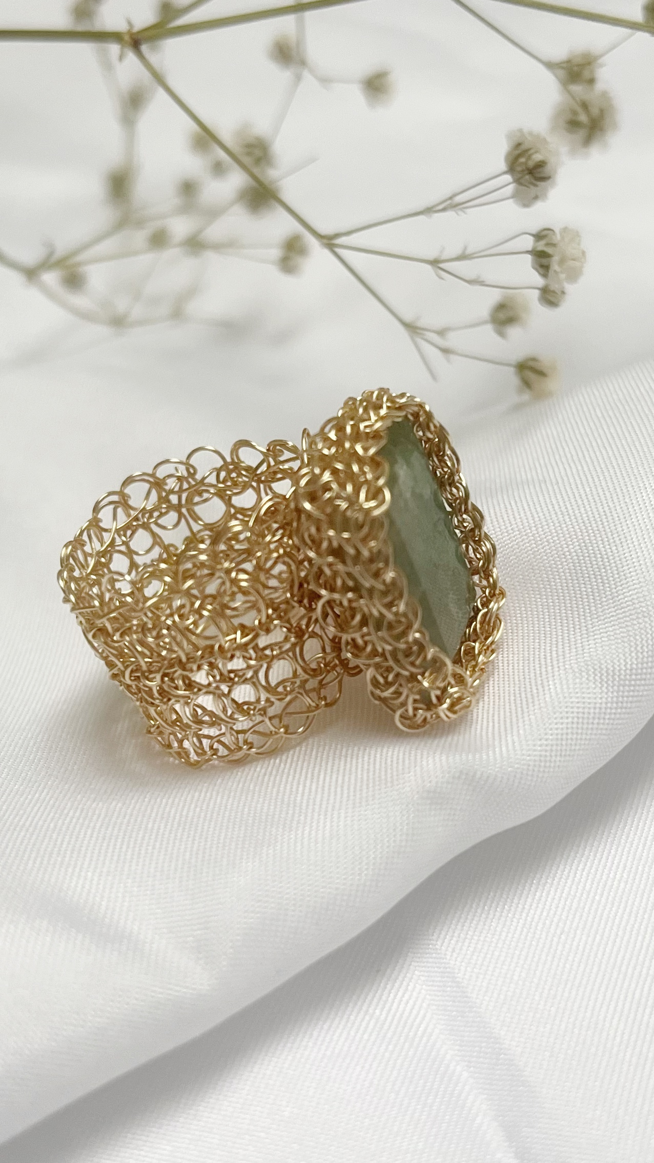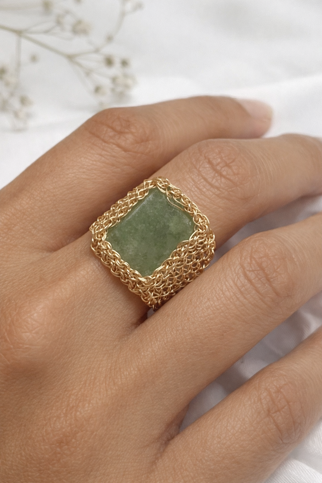 Este anillo destaca por su diseño orgánico y elegante, con una estructura de alambre entrelazado que aporta textura, personalidad y un acabado completamente exclusivo. La piedra, en tonos verdes suaves, transmite armonÃa y conexión con la naturaleza.
