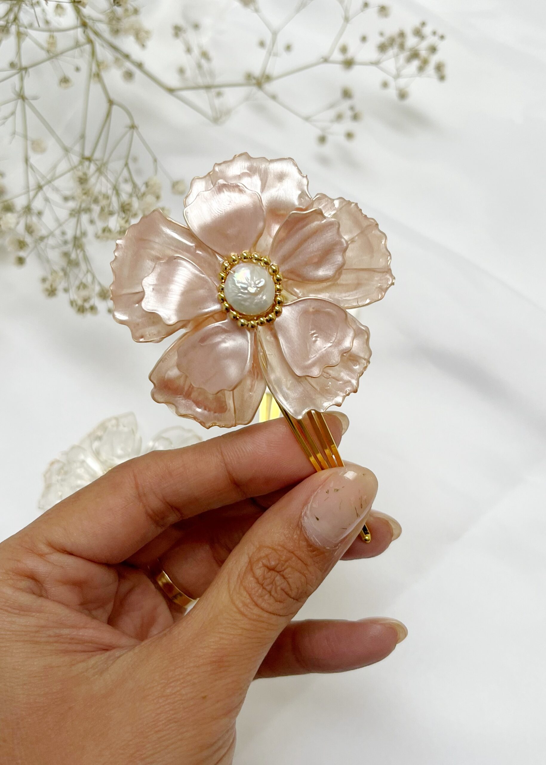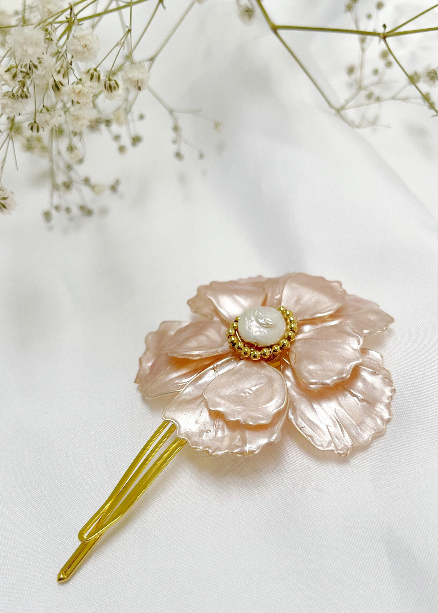 Es una pieza ligera, dedlicada y atemporal, pensada para ocaciones especiales o para elevar un look sencillo. Puedes usarla como hebilla para el cabello o como broche en tu prenda.