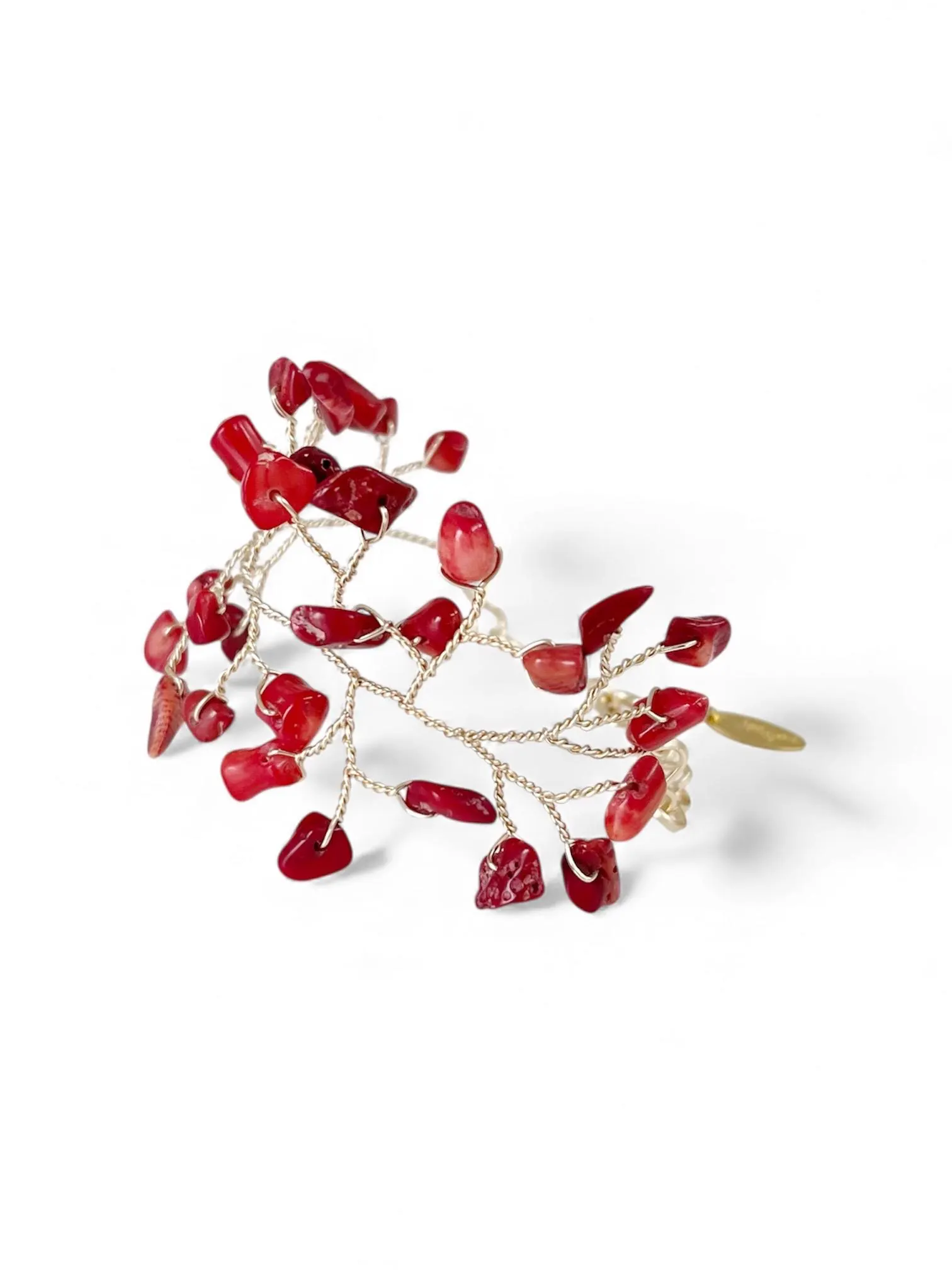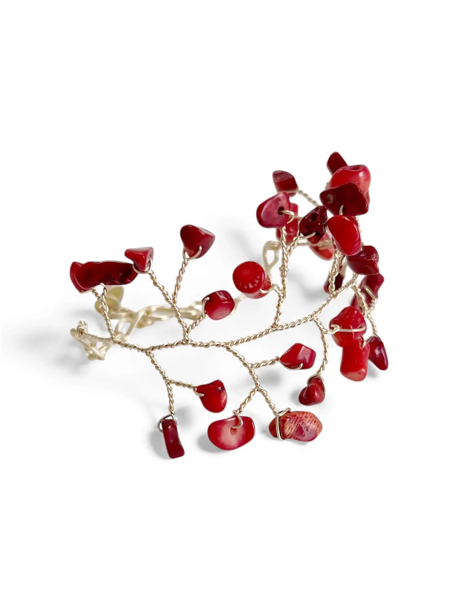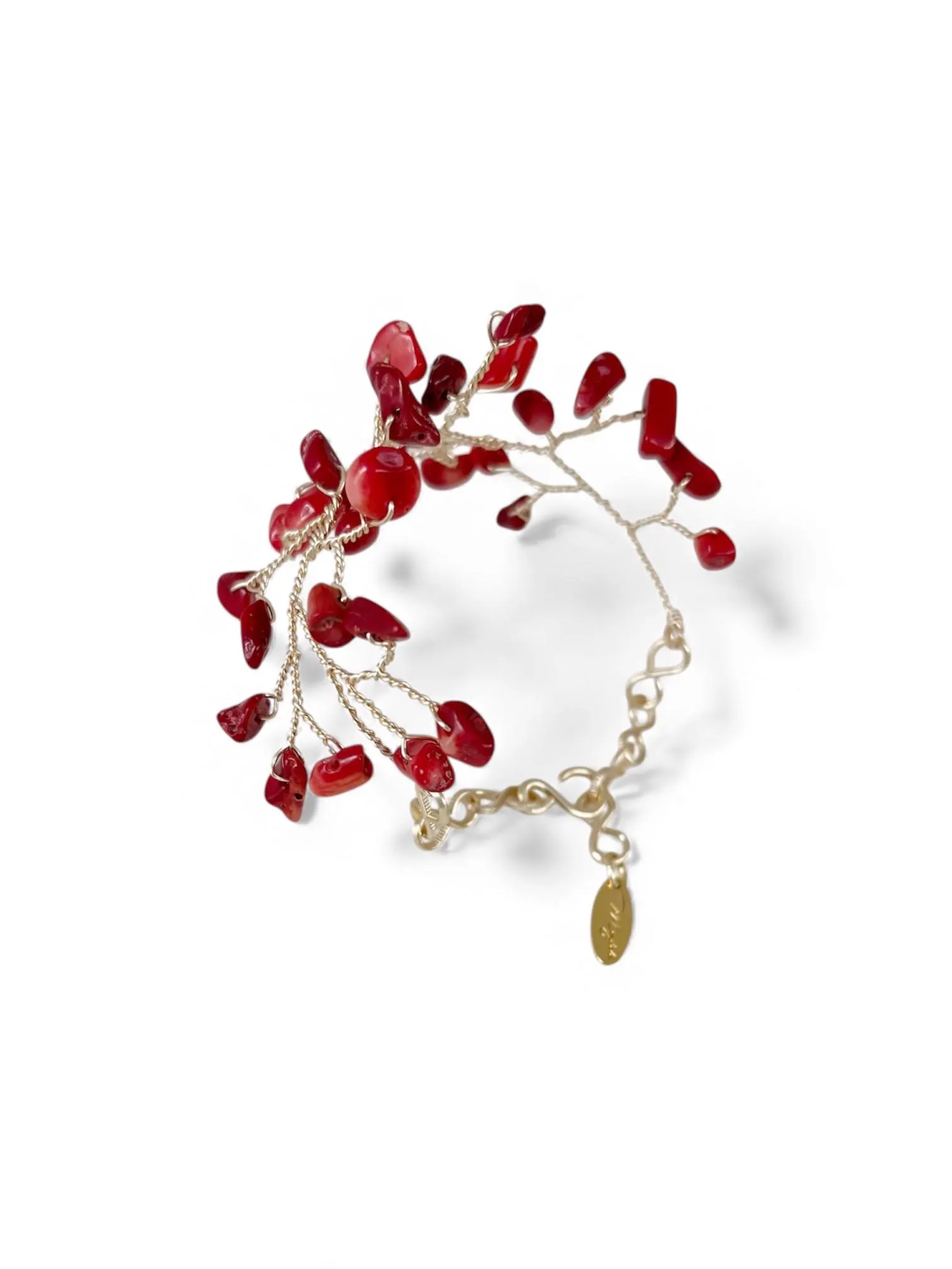 Pieza hecha a mano, tejida con alambre bañado en oro de 18 quilates y piedras naturales (coral). Colores personalizados disponibles a petición; también disponible en plata y oro rosa. Elegante, delicado y versátil, ¡te sentirás única cada vez que lo uses! Talla S (16 cm con extensor). Cuidado: Limpiar con un paño suave.