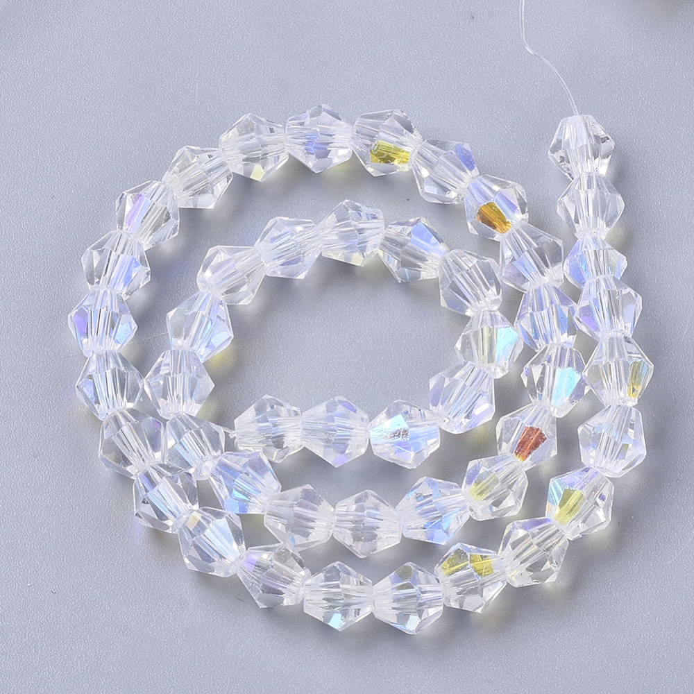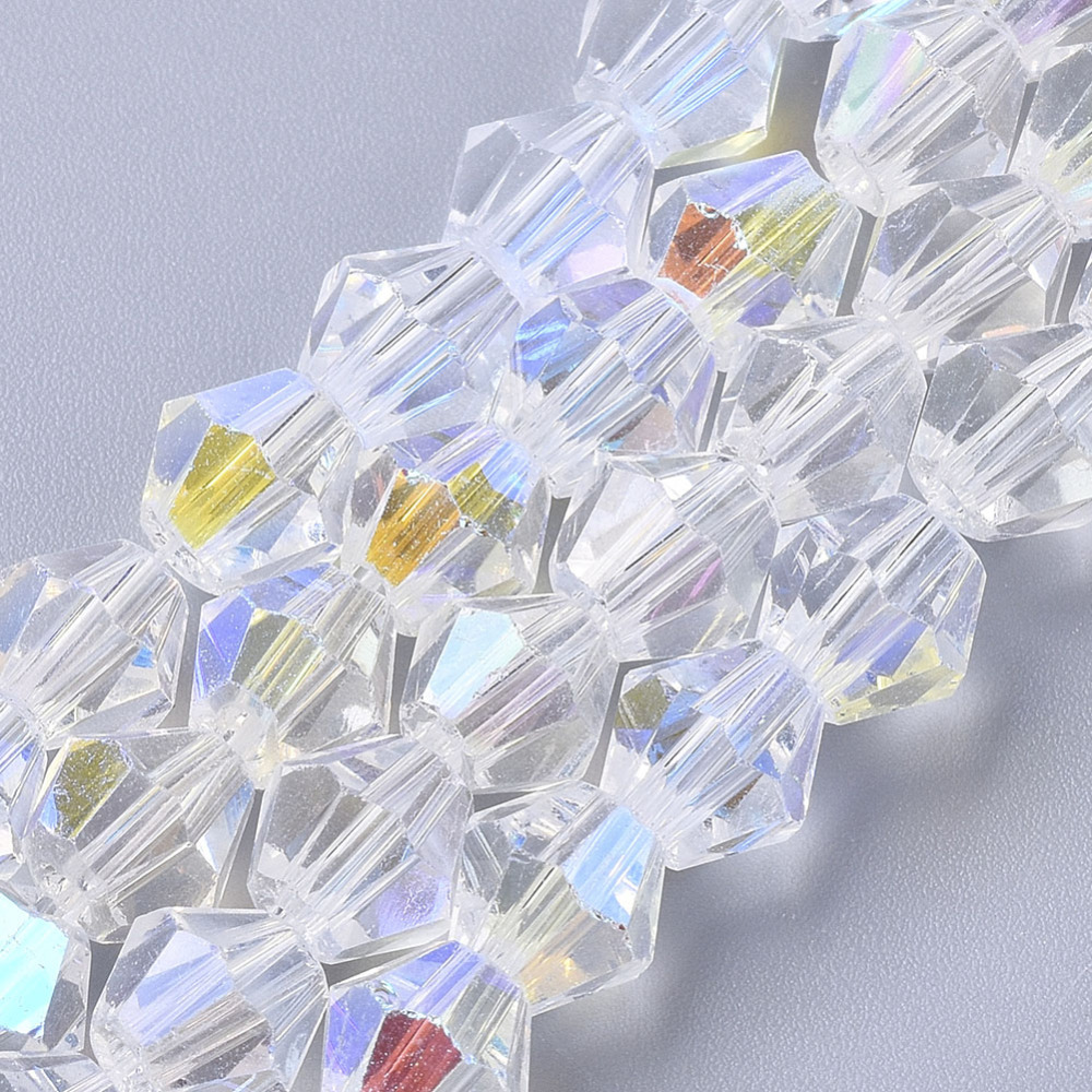 Tira de cristal Biconico electrochapado facetados, Color ab, medida 6x6mm, agujero: 1 mm, aproximadamente 45~47 piezas (27.5 cm)