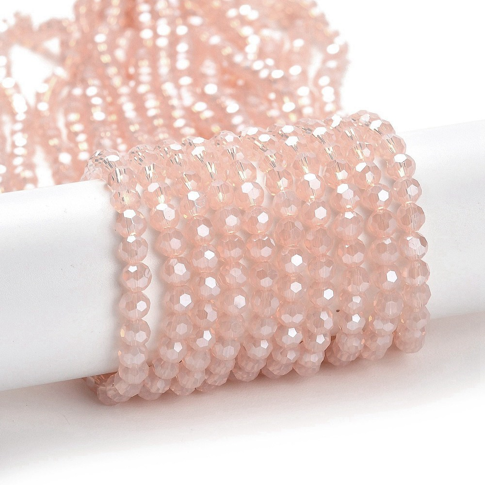 Tira de cristal electrochapado, facetado, redondo,color rosa brumosa perlado, 4mm, agujero: 0.7 mm, aproximamente 87~93 pcs / cadena, 32~33 cm
