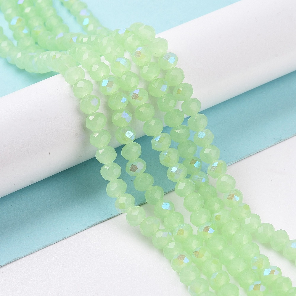 Tira de cristal electrochapado facetados rerondana plana, color verde claro 4x3mm, agujero: 0.4 mm, aproximadamente 113~115 piezas/cadena, 41~42 cm
