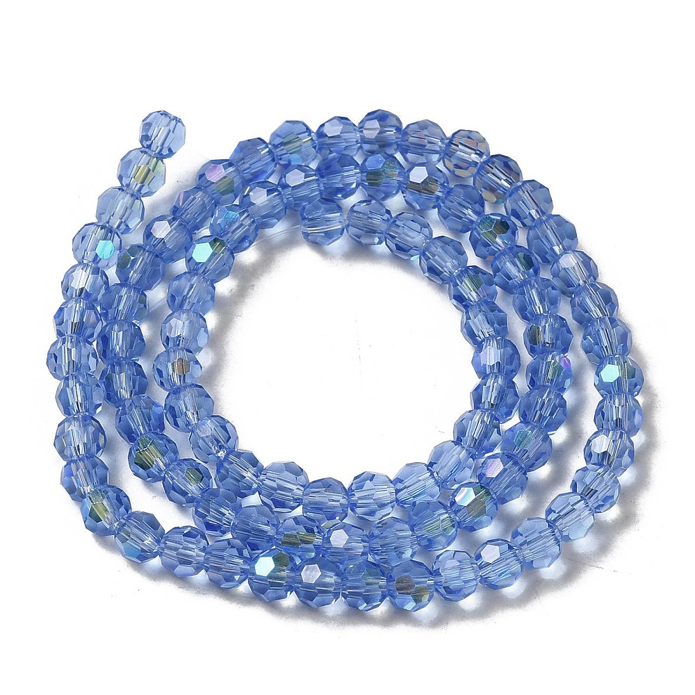 Tira de cristal Electrochapado transparentes, facetados, redondo, color azul claro 4mm, agujero: 0.7 mm, aproximamente 87~93 pcs / cadena, 32~33 cm