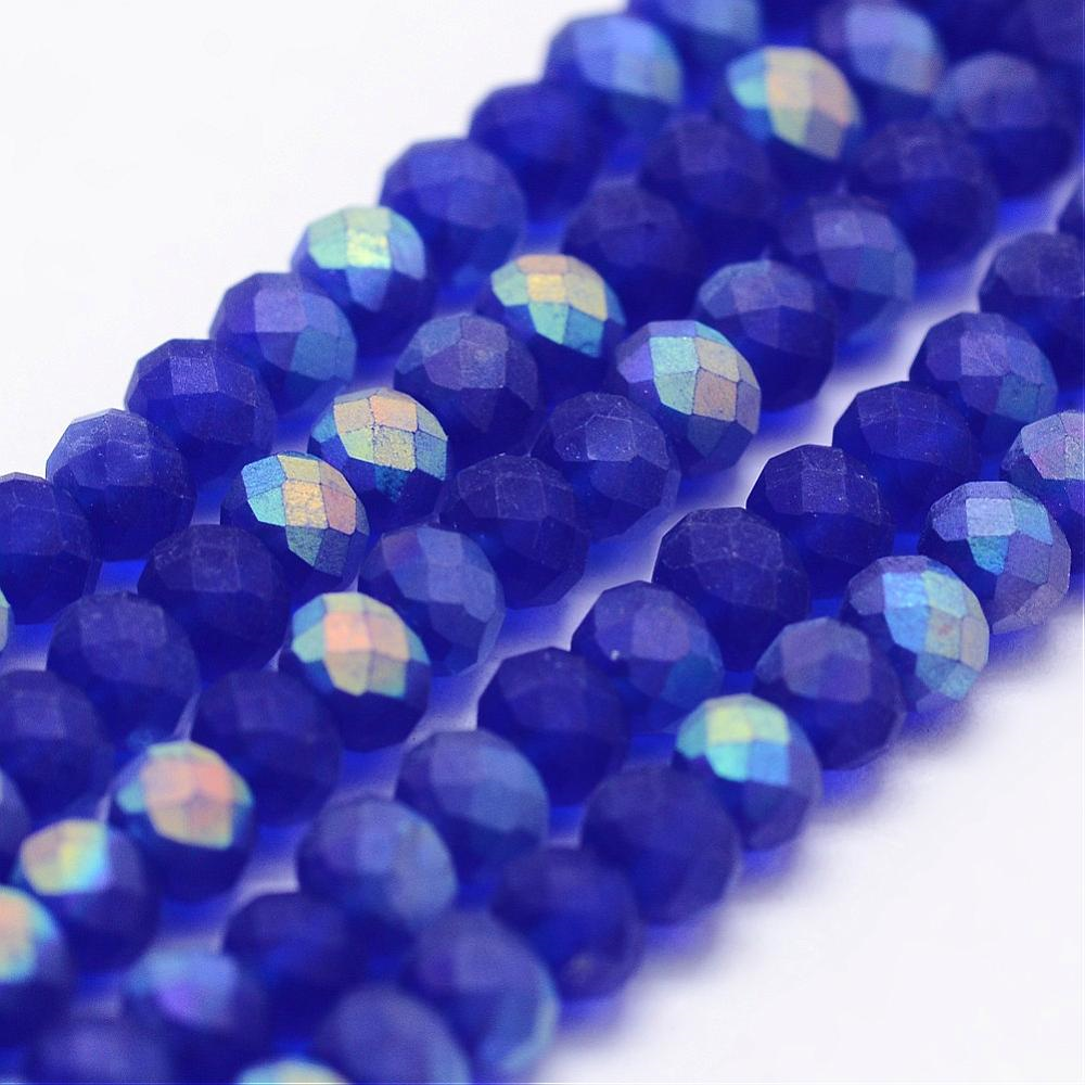 Tira de cristal facetado electrochapado rondelle , esmerilado, color azul, 4~4.5×3~3.5mm, agujero: 0.8 mm, aproximamente 150 pcs
